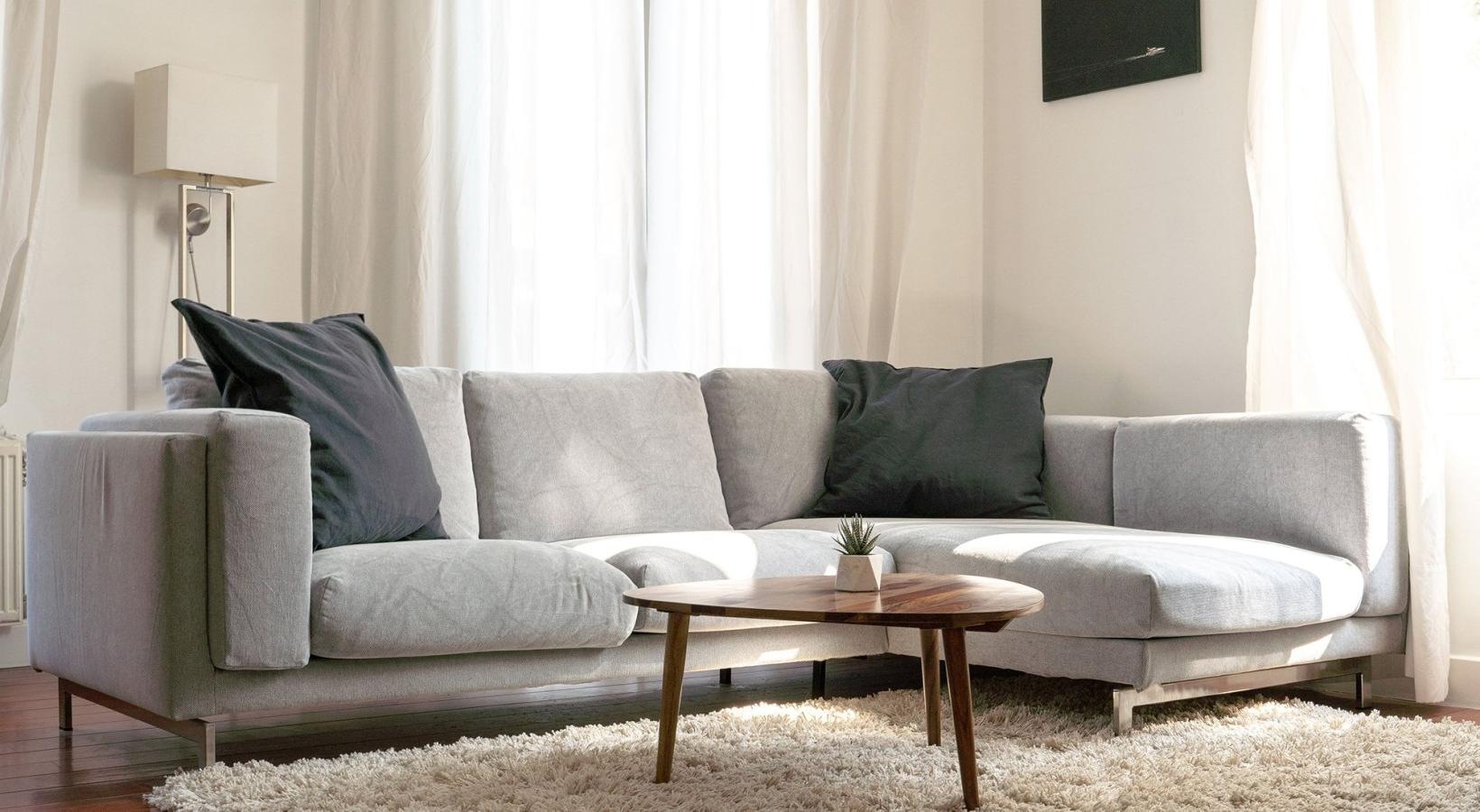 swath of sunlight shines across a well made bed and bedside table with a vase of cotton plants